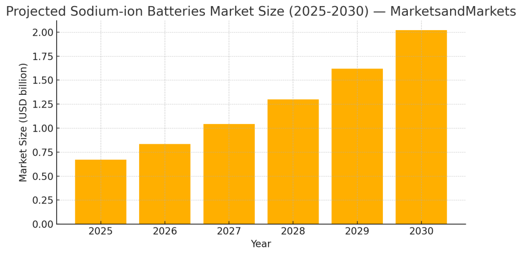 Market estimates vary, but independent reports converge on a robust growth trajectory for sodium-ion batteries over the rest of the decade. MarketsandMarkets projects the global sodium-ion battery market to expand rapidly from modest base values in 2025 to multi-billion-dollar scale by 2030, reflecting strong interest from EV makers and energy project developers. The projection used in this article (MarketsandMarkets) shows a clear compound growth path to 2030 — see the chart above for year-by-year illustration.